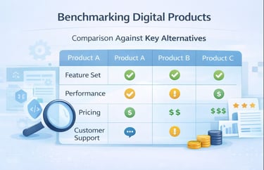 Start by identifying 3-5 direct competitors to the product you're evaluating. Create a comparison matrix that tracks key features, pricing structures, performance metrics, and user experience elements across all products.